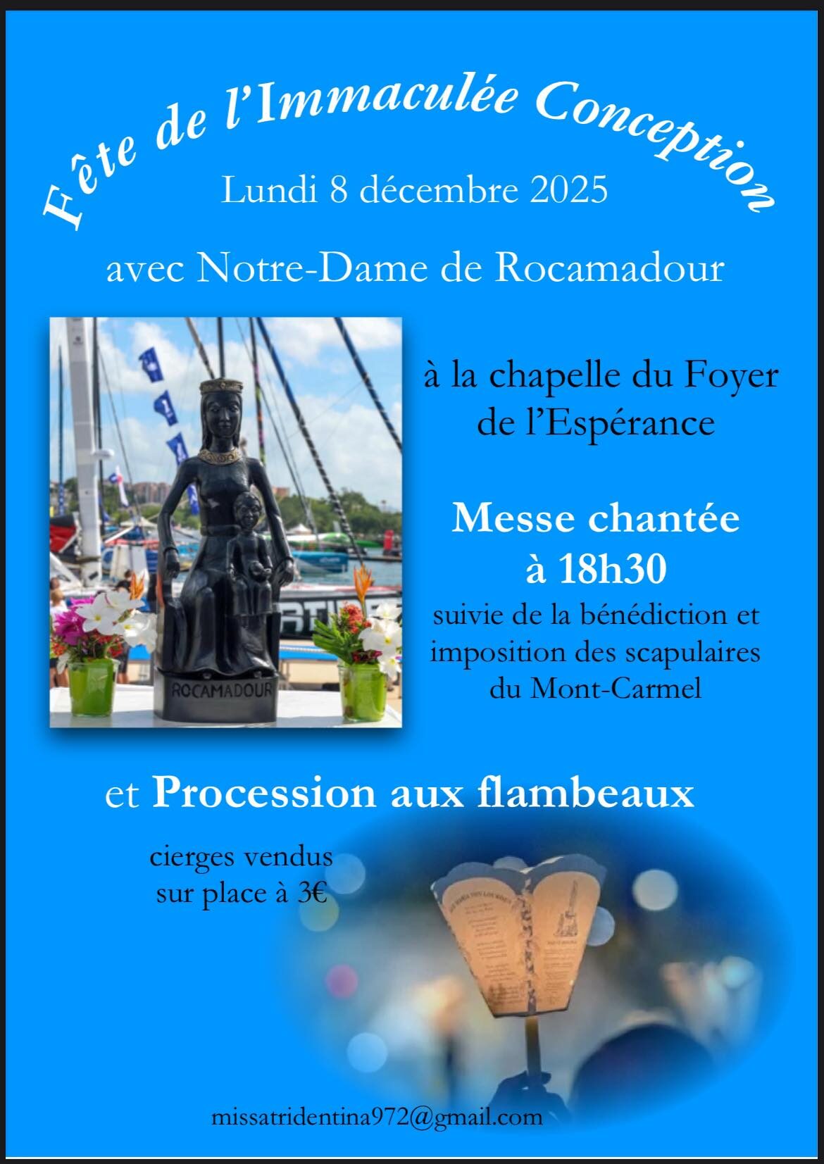 Accueil » Nos archives » Procession de l’Immaculée 2025 (8 décembre) à Fort-de-France Non classifié(e) Procession de l’Immaculée 2025 (8 décembre) à Fort-de-France Comme l’an passé, une messe traditionnelle sera célébrée à la Chapelle du Foyer de l’Espérance à Fort-de-France ce 8 décembre suivie d’une procession : Article précédentProcession de l’Immaculée 2025 (8 décembre) à Orléans Aucun article plus récent 8 décembre 2025