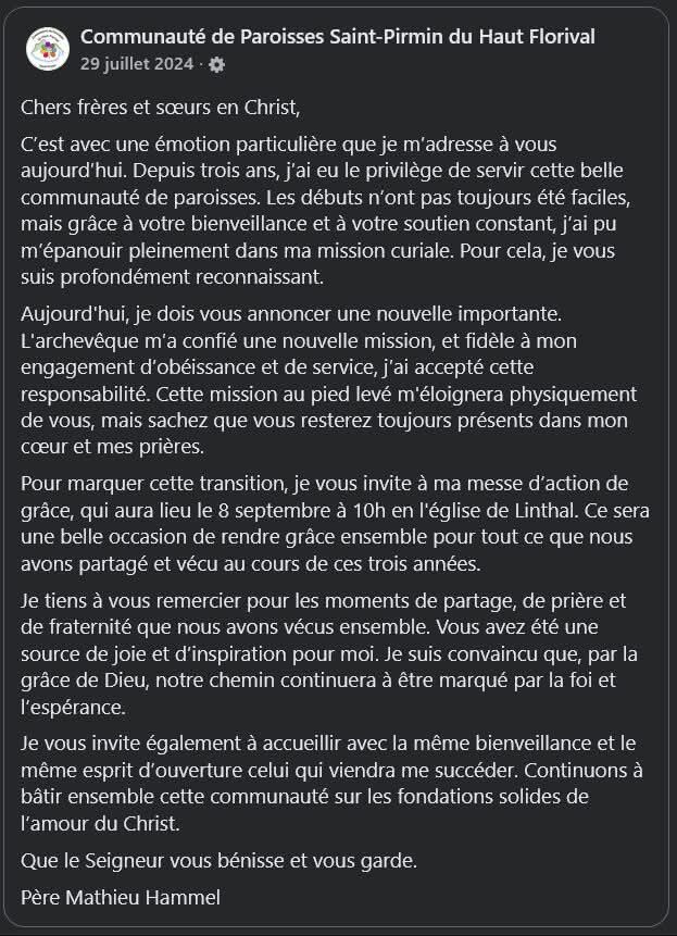 En juillet 2024 déjà, celui qui était alors curé de la paroisse Saint Pirmin du Haut Florival annonçait à ses paroissiens « une mission au pied levé » qui l’éloignait de sa paroisse hors des périodes habituelles de nomination (avril ou juin) et invitait ses paroissiens le 8 septembre à une messe d’action de grâce à Linthal.