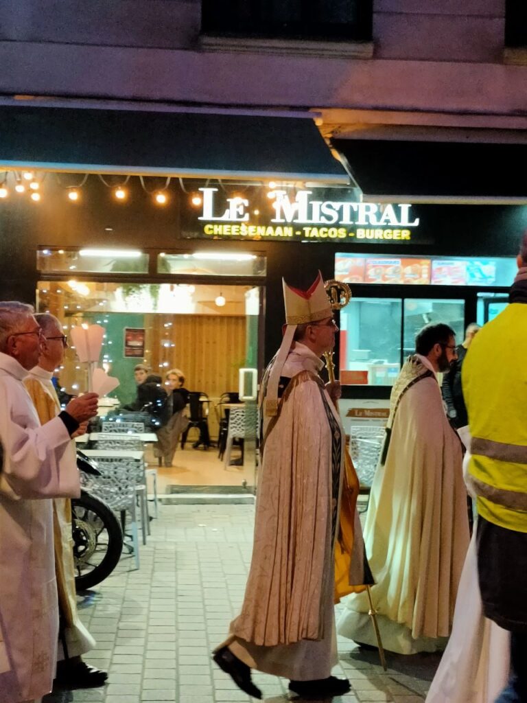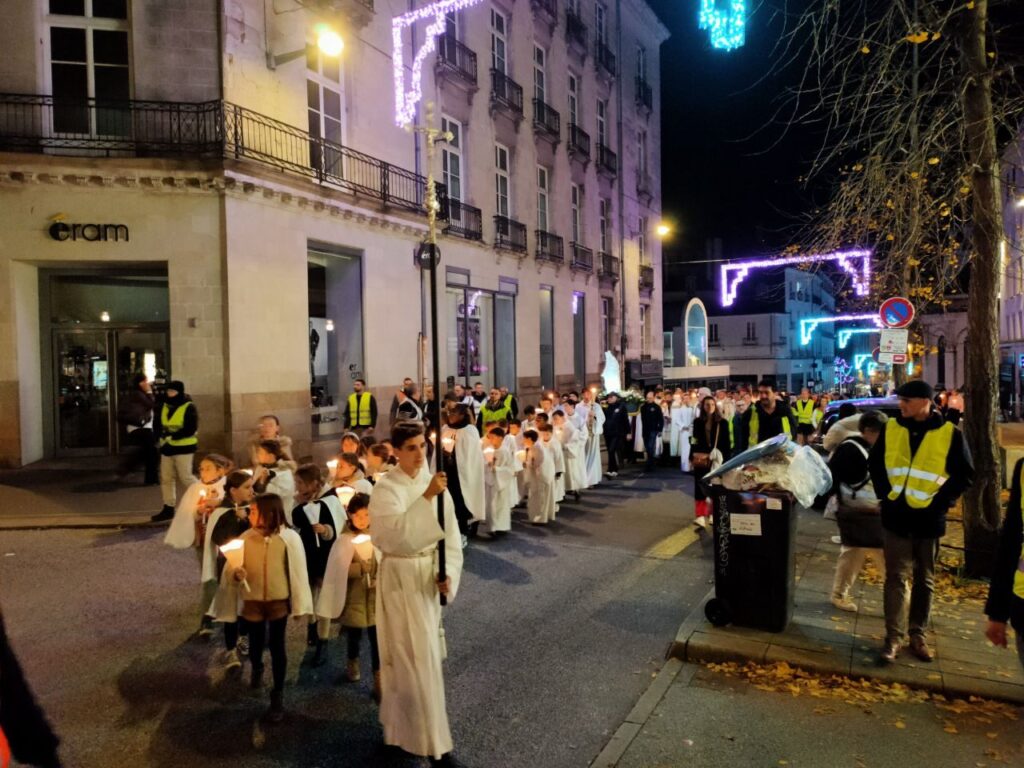 Une première procession, avec le clergé diocésain, Mgr Percerou et la FSSP, partait de plusieurs églises (St Similien et sainte Croix 19h30, St Clément 19h, chapelle de l’Immaculée Conception à l’issue de la messe de la FSSP), se rassemblait à Saint-Nicolas et allait à Notre-Dame de Bon Port. Elle a réuni plus de 3000 fidèles, soit une affluence supérieure à l’an dernier (entre 1800 et 2300), moins doux.