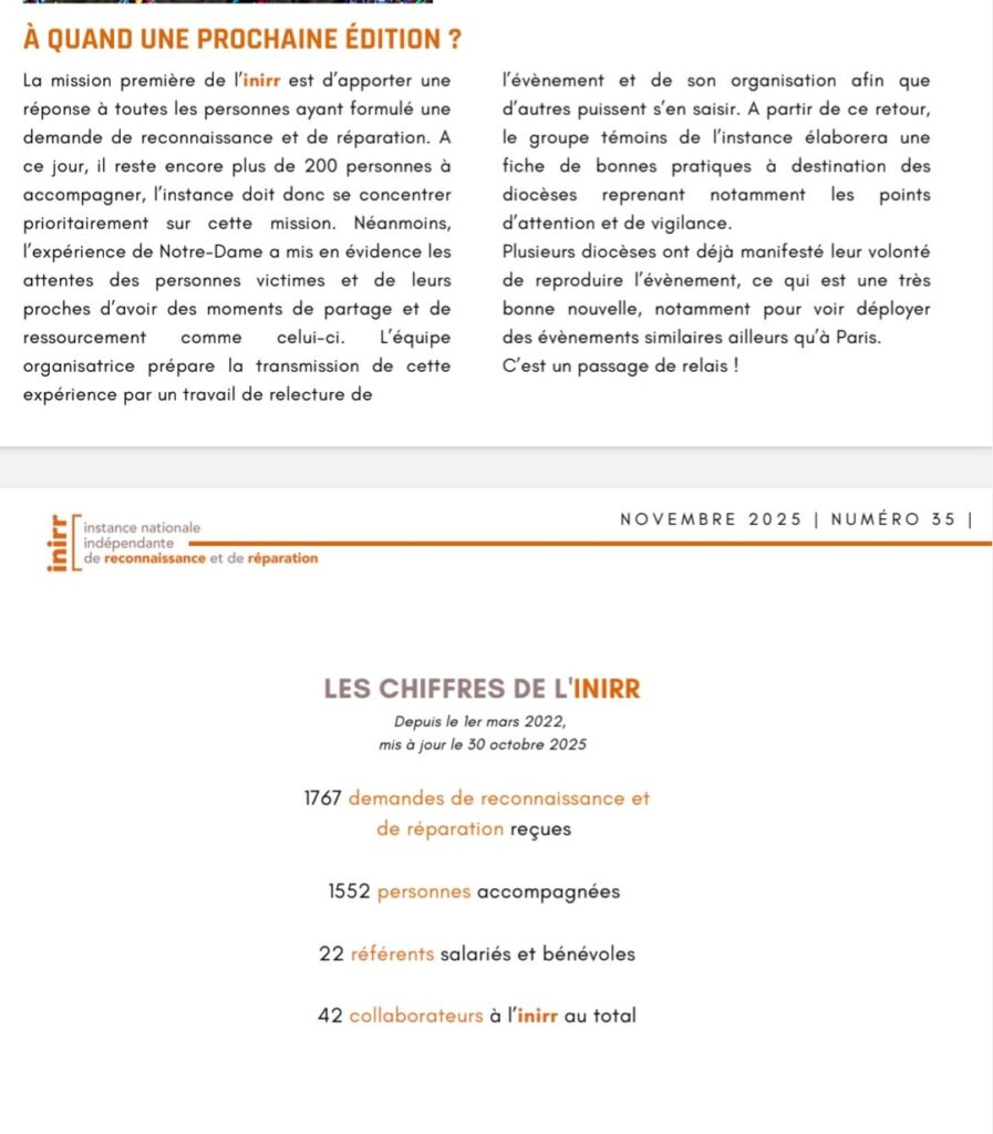 Le bulletin de novembre de l’INIRR – l’instance mise en place par les diocèses pour écouter, accompagner et établir le préjudice des victimes d’abus sexuels du clergé et des laïcs en mission d’église dans les diocèses et l’enseignement diocésain (non congréganiste) fait état de :