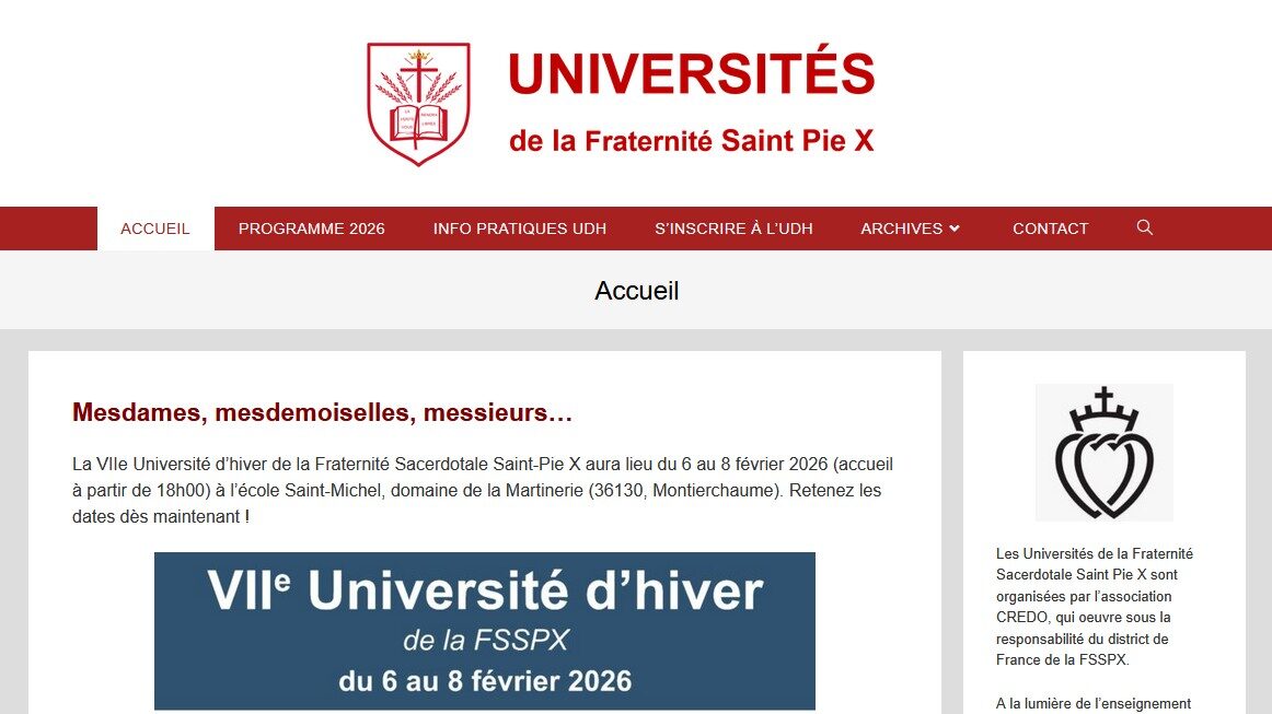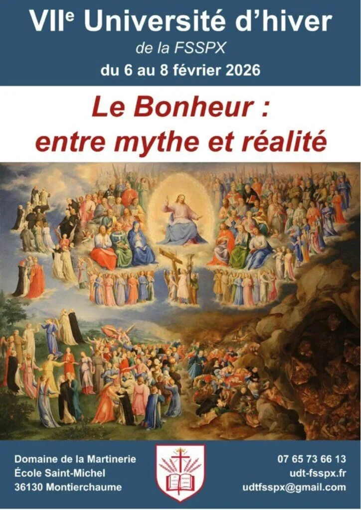 Voici le programme de l’Université d’hiver de la Fraternité Saint Pie X, qui se tiendra du 6 au 8 février 2026 à Montierchaume (Châteauroux) :