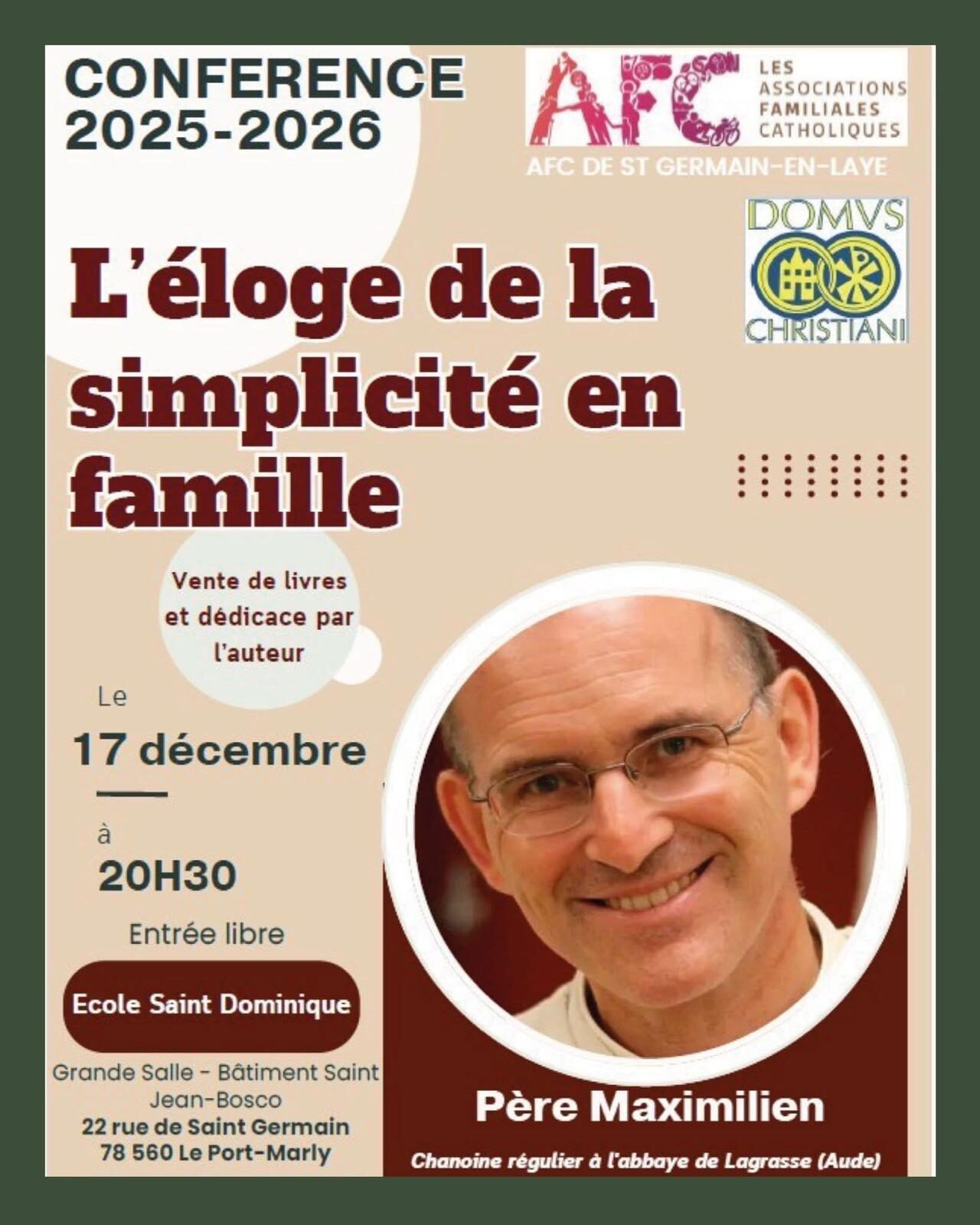 Les AFC de Saint-Germain en Laye (78) et Domus Christiani proposent une conférence « L’éloge de la simplicité en famille« du Père Maximilien (abbaye de Lagrasse) le mercredi 12 décembre à 20h30 au Pecq (Batiment Saint Jean Bosco, Ecole Saint Dominique, 18 av. Charles de Gaulle, 78230 Le Pecq)