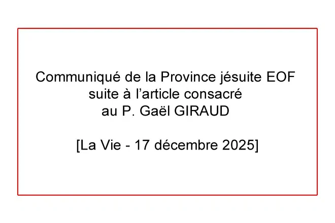 A la suite de la parution dans le magazine La Vie daté du mercredi 17 décembre 2025 de plusieurs témoignages faisant état de faits graves reprochés au Père Gaël Giraud, la Province jésuite d’Europe occidentale francophone souhaite témoigner tout son soutien à l’égard des personnes qui ont été blessées dans leur intégrité morale et physique.