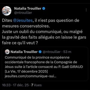 À la suite des révélations – accablantes de la Vie ce mercredi 17 décembre sur le jésuite – et économiste anti libéral Gaël Giraud – les jésuites ont communiqué, mais il ne semble pas y avoir un mot sur d’éventuelles mesures conservatoires, comme le relève Natalia Trouiller.