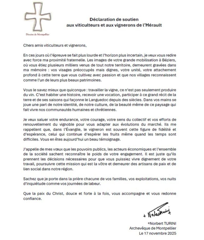 Mi novembre le diocèse de Montpellier a fait paraître un communiqué de soutien aux vignerons et viticulteurs de l’Hérault, se joignant aux quelques diocèses – avec Bayonne et Perpignan – qui ont montré leur solidarité avec les paysans français.