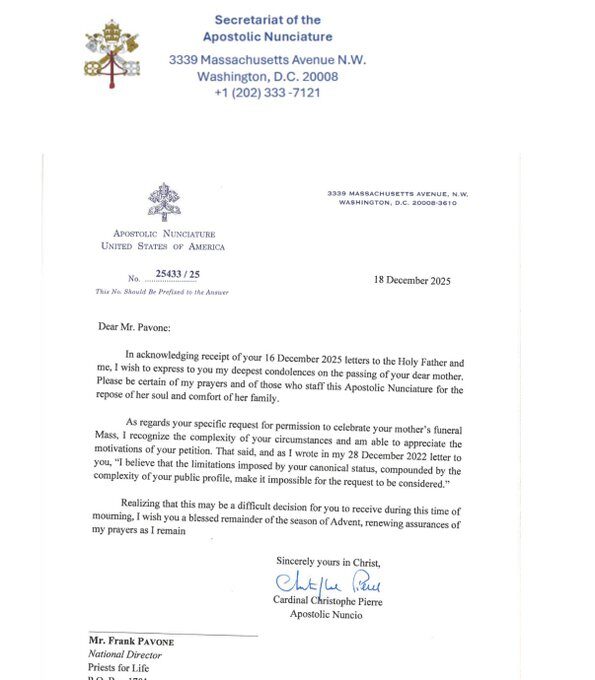 Dans une lettre du 13 décembre adressée aux évêques américains, Mgr Christophe Pierre, Nonce apostolique aux États-Unis, a écrit que le Préfet du Dicastère pour le Clergé a émis la décision le 9 novembre, ajoutant qu’il n’y avait “aucune possibilité d’appel”.