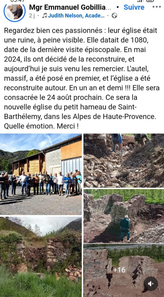 Il y a des églises qui tombent en ruine, faute d’entretien suffisant, et dont le clocher doit être déposé à quelques jours de Noël comme à Saint-Hilaire-de-Chaléons (44), ou des communes où des associations se retrouvent à devoir aider les mairies à assumer les travaux urgents comme à Sérifontaine (60). Mais comme pour les calvaires, il y a aussi des églises que l’on rebâtit et qu’on rend au culte. Emmanuel Gobilliard, évêque de Digne, partage sur ses réseaux sociaux des photos de l’aventure des habitants de Saint-Barthélémy, un hameau de son diocèse, où ils ont décidé, à partir de mai 2024, de reconstruire leur église ruinée qui datait de 1080, et dont il ne restait que la base des murs.