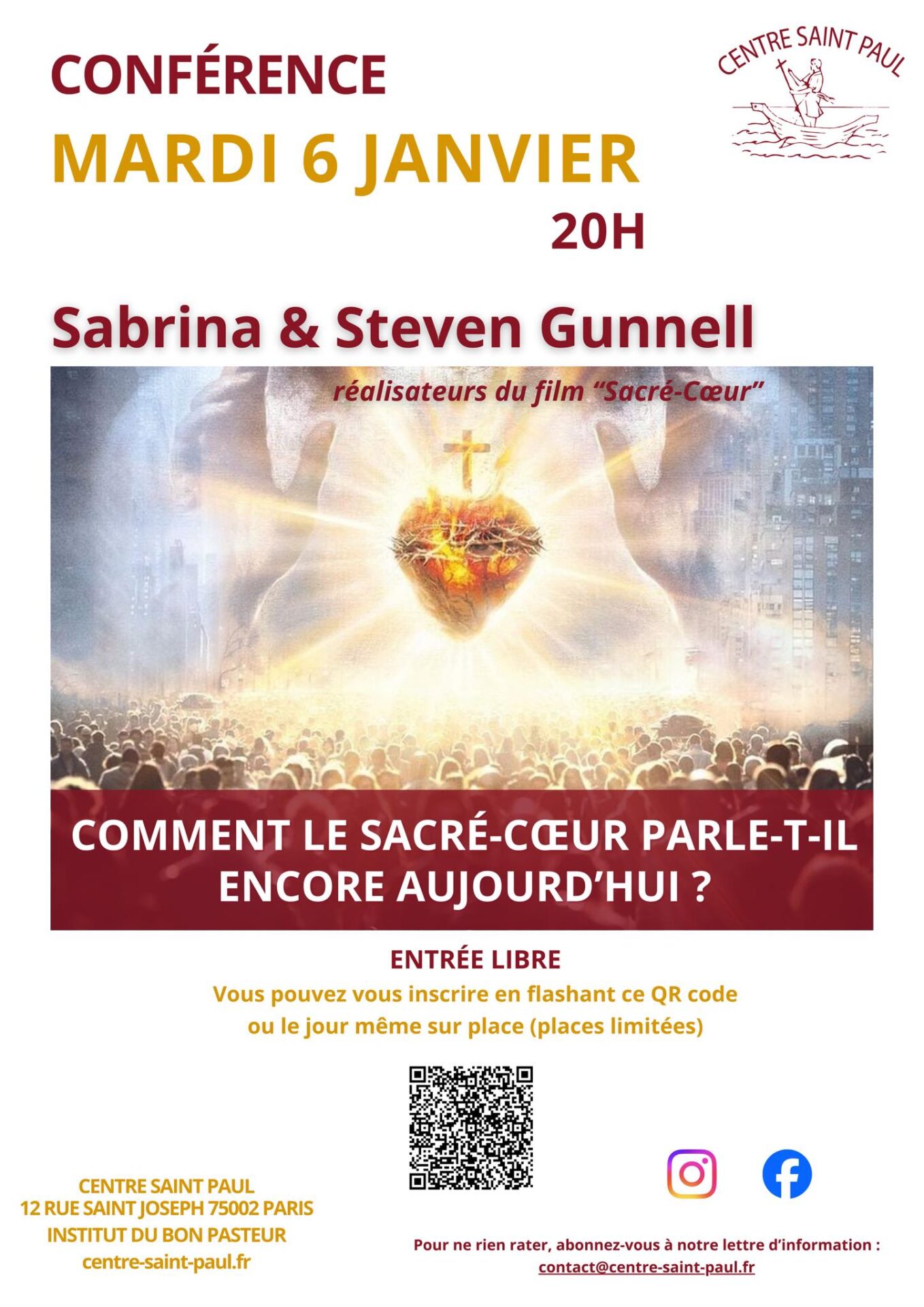 Le Centre Saint-Paul (Institut du Bon Pasteur – 12 rue Saint-Joseph – Paris 2è) propose une conférence de Sabrina et Steven Gunnel « Comment le Sacré-Coeur parle-t-il encore aujourd’hui ? » le mardi 6 janvier à 20h00 (Messe de la solennité de l’Epiphanie à 19h00) :
