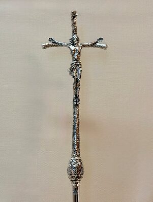 C’est le pape Saint Paul VI qui, le 8 décembre 1965, à l’occasion de la clôture du Concile Vatican II, utilisa une « crosse » en argent avec la figure du crucifix. Le sculpteur Lello Scorzelli, à qui elle avait été commandée, a ainsi voulu exprimer la vocation de l’apôtre Paul, dont le pape avait choisi de porter le nom : celle d’être témoin et annonciateur du Christ crucifié (cf. 1 Co 2, 2).