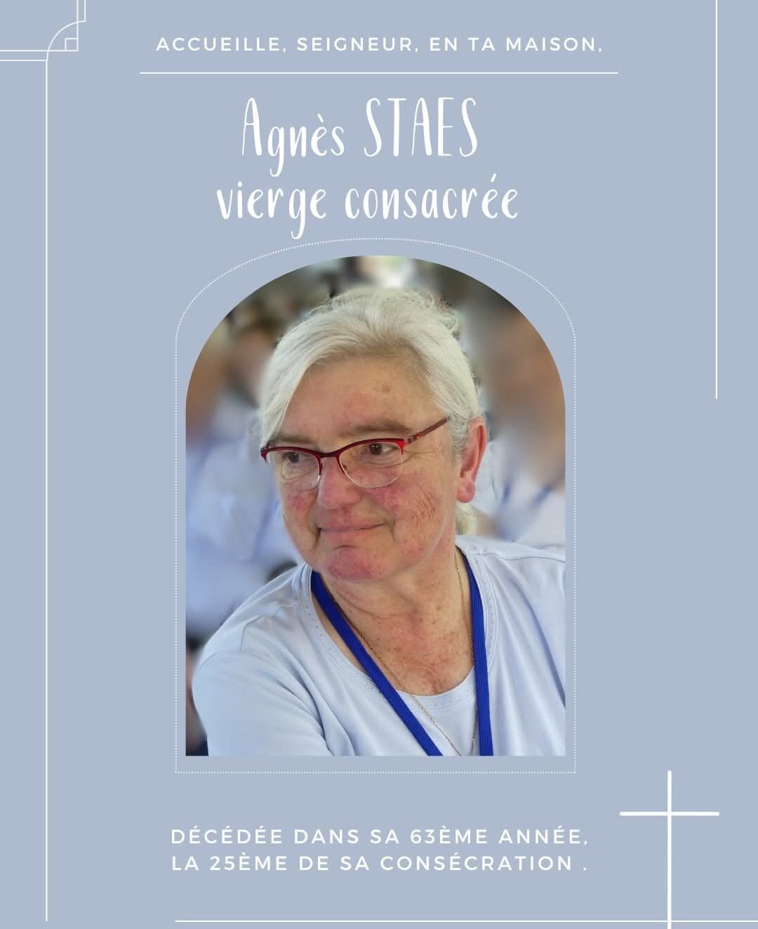 « Nous recommandons à la prière des communautés chrétiennes mademoiselle Agnès STAES, vierge consacrée, décédée le samedi 3 janvier 2026 dans sa 63ème année, la 25ème de sa consécration.