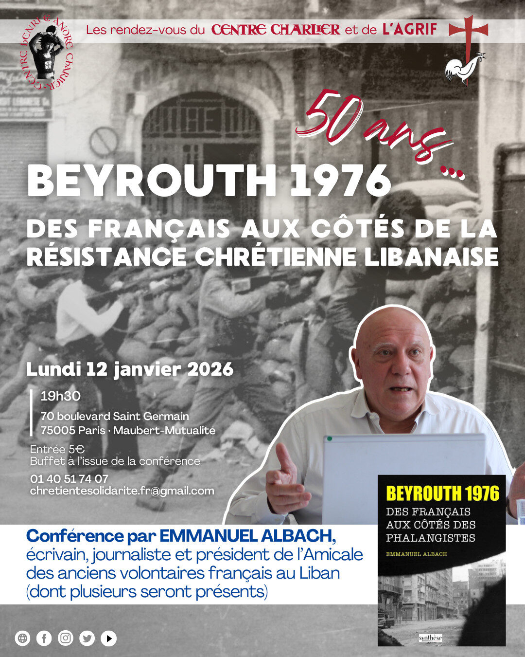Le Centre Charlier et l’AGRIF reçoivent en conférence Emmanuel Albach le lundi 12 janvier à 19h30 au CentreCharlier (Paris 5e) : « Beyrouth 1976, des Français aux côtés de la résistance chrétienne libanaise »