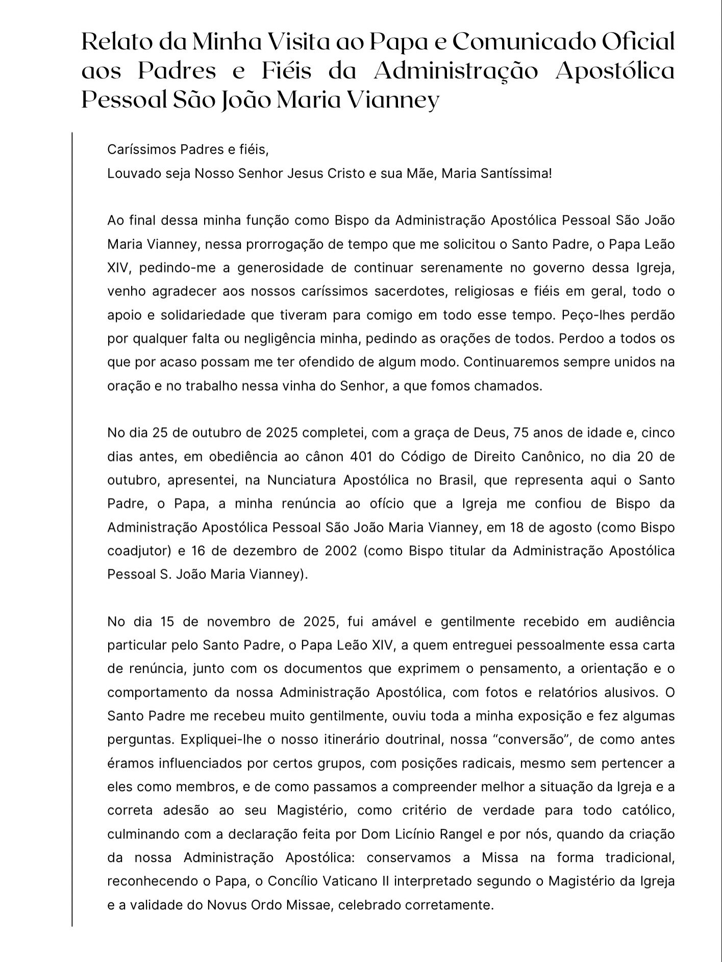 Mgr Fernando Rifan, administrateur de l’administration apostolique Saint-Jean Marie Vianney de Campos (Brésil), a publié un long communiqué à l’attention des prêtres et des fidèles suite à sa visite à Rome en novembre 2025. Il évoque les perspectives de nomination d’un successeur pour l’administration apostolique dont il a la charge.