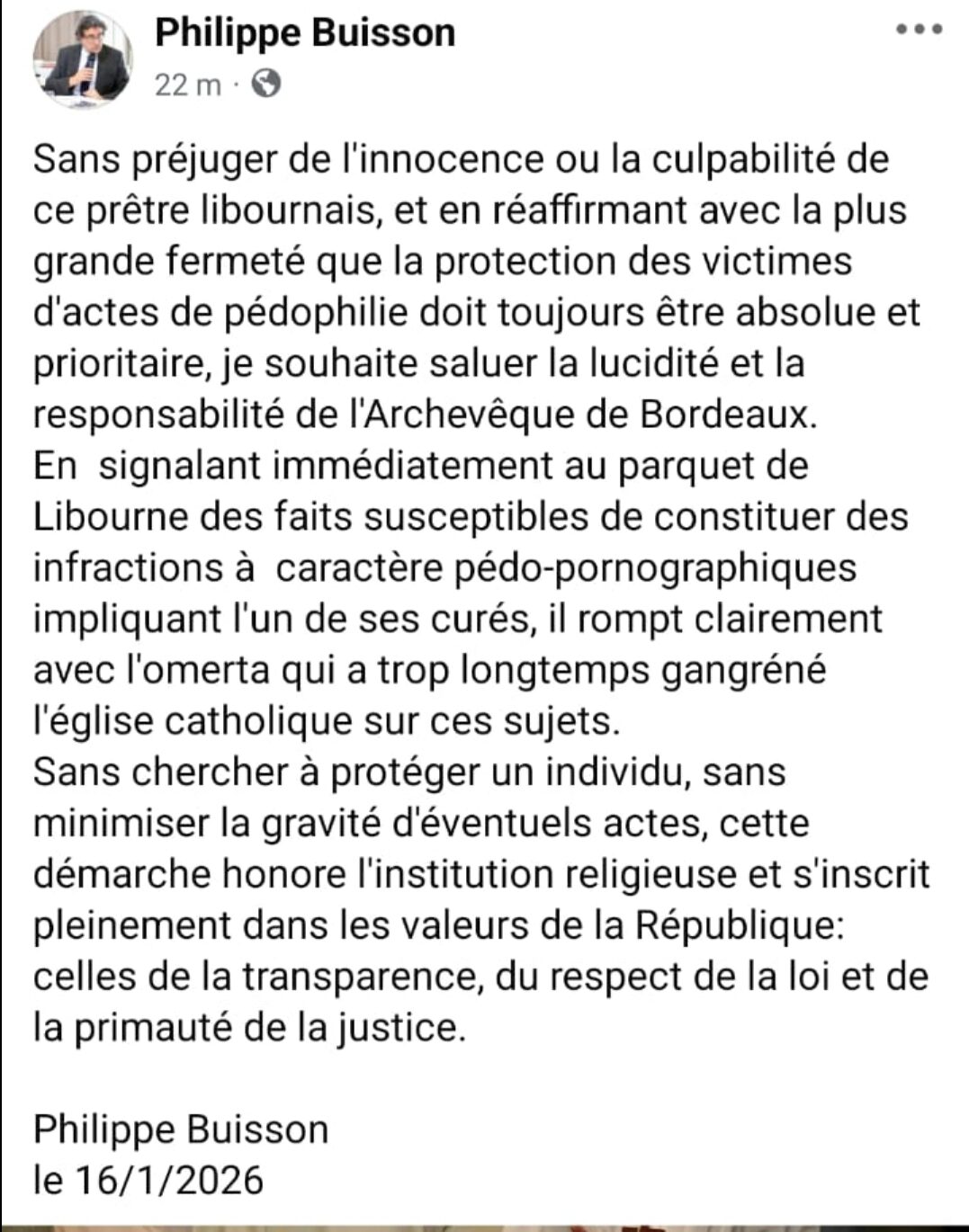 Le maire de Libourne a lui aussi communiqué sur le sujet, sur Facebook et « salue la lucidité et la responsabilité de l’archevêque de Bordeaux » qui « rompt clairement avec l’omerta qui a trop longtemps gangrené l’Eglise catholique sur ces sujets ».