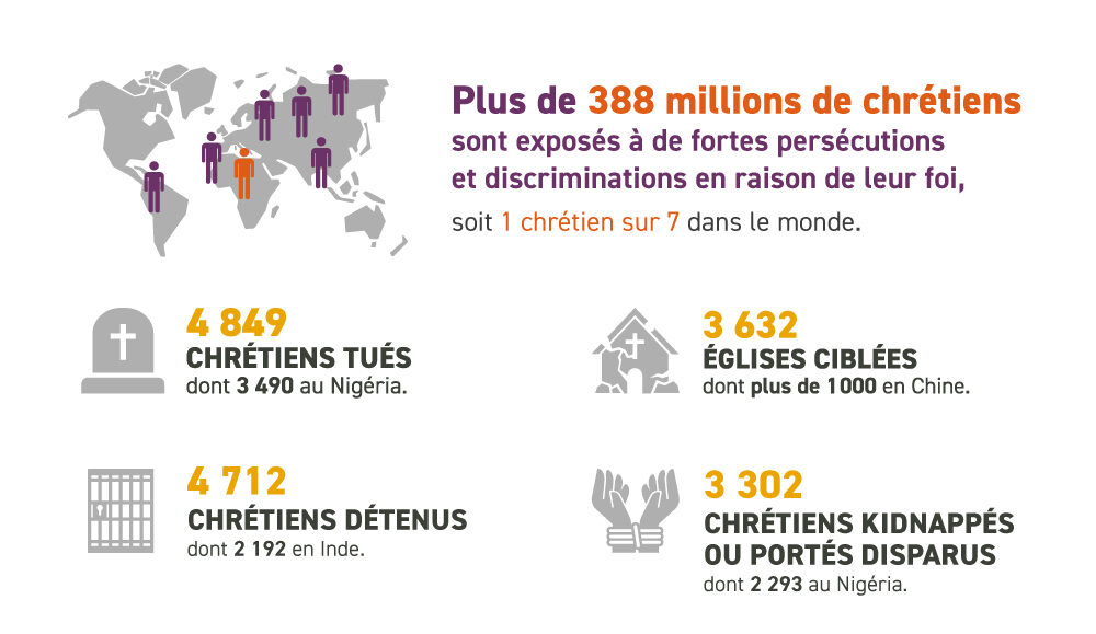 Les chiffres du nouvel Index mondial de persécution 2026, publié mercredi 14 janvier par l’ONG protestante Portes Ouvertes, montrent que la situation des chrétiens dans le monde s’est aggravée entre le 1er octobre 2024 et le 30 septembre 2025 (la période couverte par le rapport). L’organisation répertorie chaque année les 50 pays dans lesquels il est le plus dangereux de vivre et de professer sa foi. Le rapport parle de 388 millions de chrétiens dans le monde (notamment 2 sur 5 en Asie) exposés à un niveau élevé de persécution et de discrimination en raison de leur foi. Près d’un chrétien sur sept dans le monde, soit plus de 388 millions, fait face à « un niveau élevé de persécution et de discrimination » à cause de sa foi.