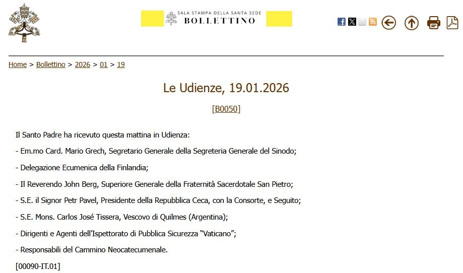 D’après le site du Saint-Siège (19/01/26), le Pape Léon XIV a reçu ce jour en audience l’abbé John Berg, Supérieur Général de la Fraternité Sacerdotale Saint-Pierre :