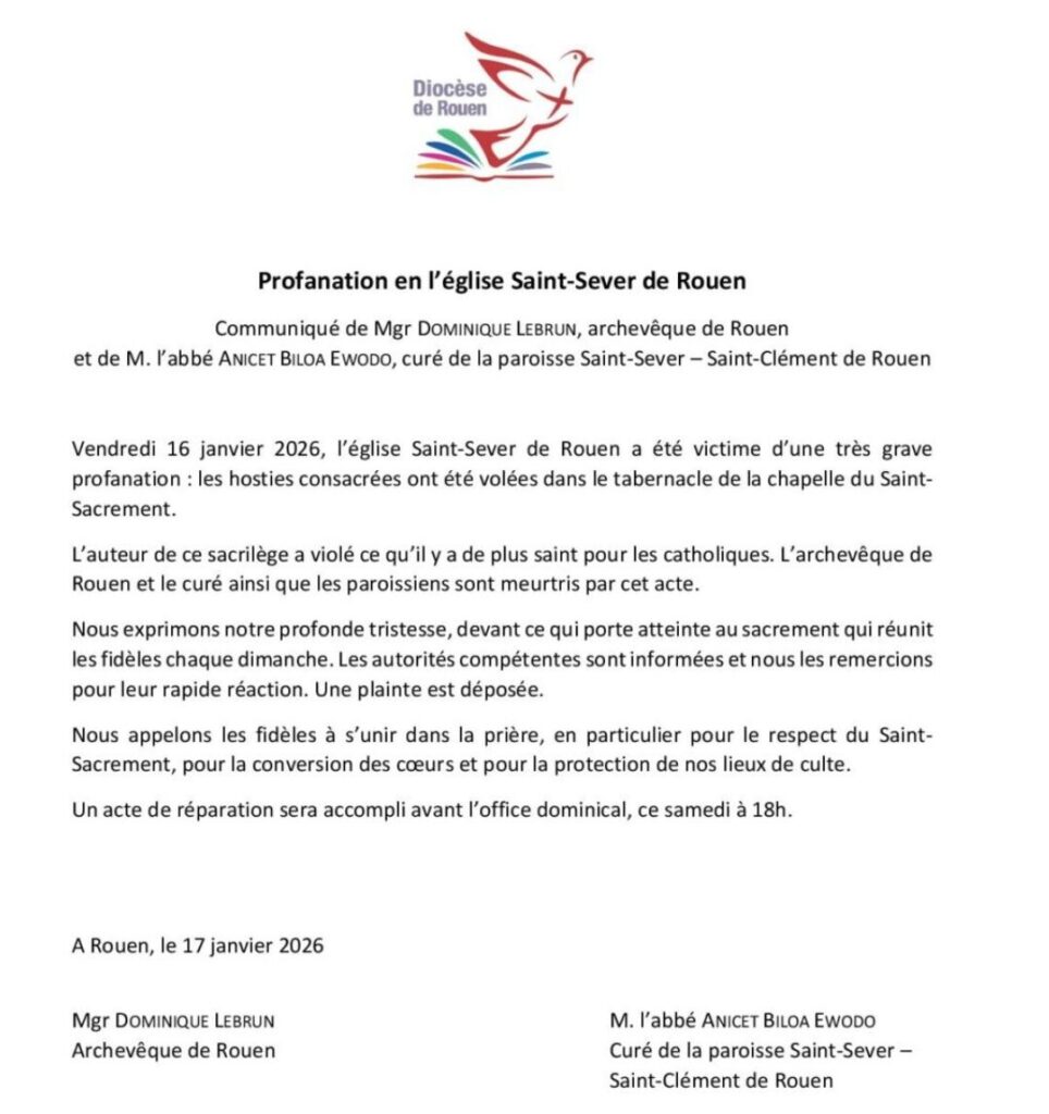 Accueil » Nos archives » Profanation d’une église : communiqué du diocèse de Rouen Église en France Profanation d’une église : communiqué du diocèse de Rouen Suite à la profanation de l’église Saint Sever de Rouen le 16 janvier dernier où les hosties consacrées ont été volées dans le tabernacle, le diocèse de Rouen communique : Article précédentBénédictines du Sacré Coeur de Montmartre : le lourd héritage d'un "contexte post-conciliaire particulièrement instable" Article suivantVers un voyage du pape Léon XIV en Espagne et Catalogne ? 20 janvier 2026
