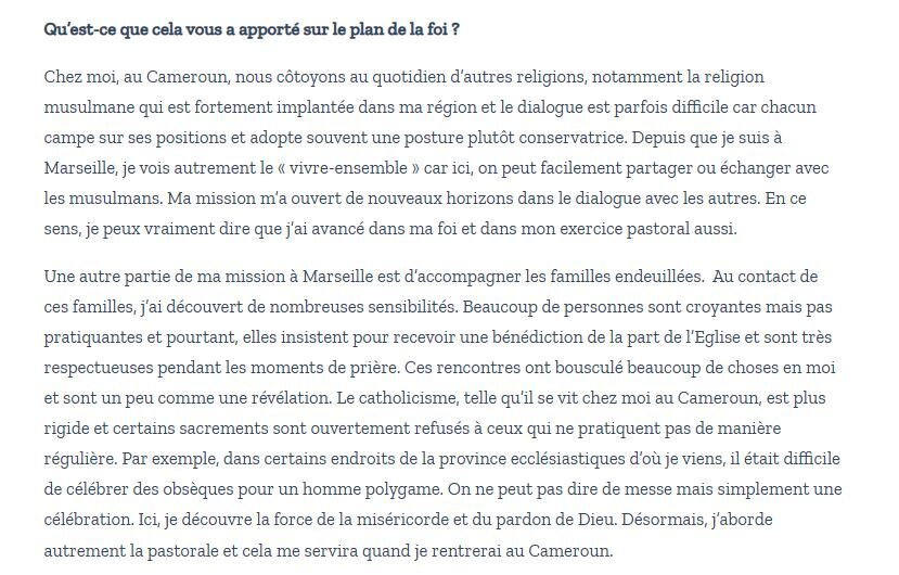 « . Le catholicisme, telle qu’il se vit chez moi au Cameroun, est plus rigide et certains sacrements sont ouvertement refusés à ceux qui ne pratiquent pas de manière régulière. Par exemple, dans certains endroits de la province ecclésiastiques d’où je viens, il était difficile de célébrer des obsèques pour un homme polygame. On ne peut pas dire de messe mais simplement une célébration. Ici, je découvre la force de la miséricorde et du pardon de Dieu. Désormais, j’aborde autrement la pastorale et cela me servira quand je rentrerai au Cameroun ».