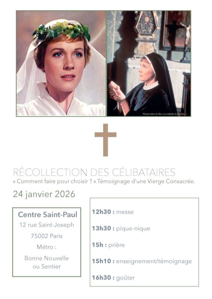 Accueil » Nos archives » Récollection des célibataires au Centre Saint-Paul (Paris) ce 24 janvier Summorum Pontificum Récollection des célibataires au Centre Saint-Paul (Paris) ce 24 janvier Le Centre Saint-Paul (12 rue Saint-Joseph – Paris 2è) propose ce samedi 24 janvier une courte récollection pour célibataires : Centre Saint-Paul – Paris (Facebook) Article précédentMgr de Germay (Lyon) : euthanasie, un sursaut est possible Aucun article plus récent 24 janvier 2026