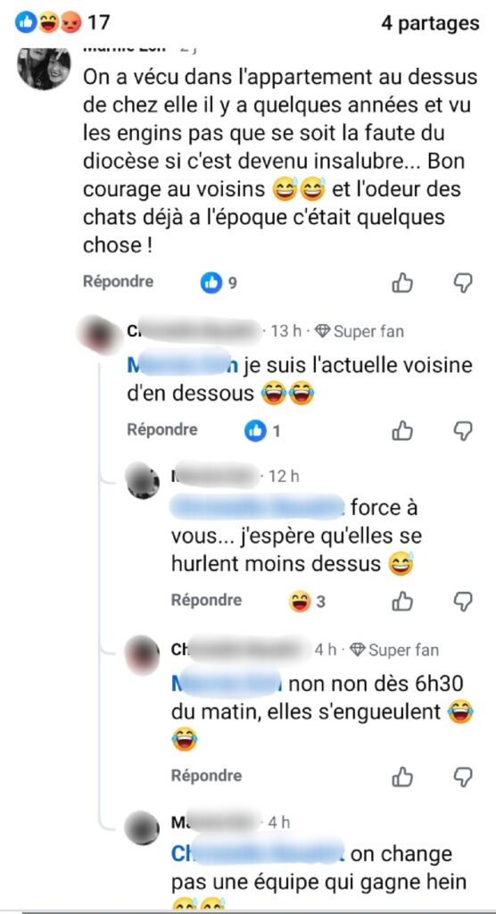 Sur les réseaux sociaux – et notamment en commentaire de l’article – anciens et actuels voisins des locataires font état des nuisances liées à l’odeur des chats depuis plusieurs années, et laissent entendre que les torts ne sont pas exclusivement du côté du diocèse.