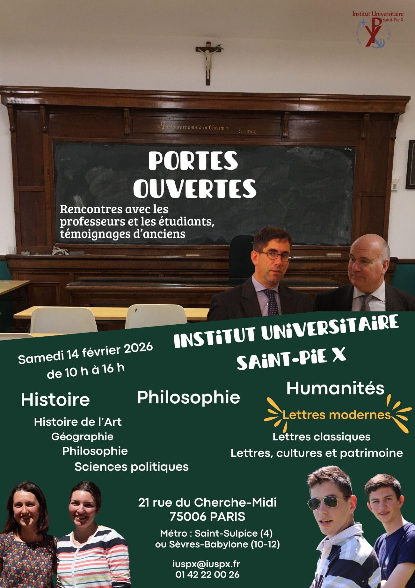 Accueil » Nos archives » [Agenda] Journée portes-ouvertes à l’Institut Université Saint-Pie X à Paris le 14 février Summorum Pontificum [Agenda] Journée portes-ouvertes à l’Institut Université Saint-Pie X à Paris le 14 février Un lecteur nous invite à diffuser cette annonce pour la journée portes-ouvertes à l’Institut Université Saint-Pie X à Paris le 14 février : Institut Université Saint-Pie X Article précédentLassaliens : changement du responsable en France au 1er août Aucun article plus récent 30 janvier 2026