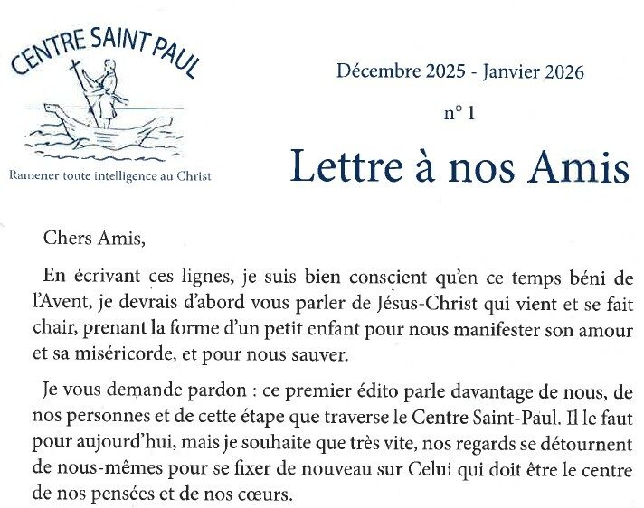 Je vous demande pardon : ce premier édito parle davantage de nous, de nos personnes et de cette étape que traverse le Centre Saint-Paul. Il le faut pour aujourd’hui, mais je souhaite que très vite, nos regards se détournent de nous-mêmes pour se fixer de nouveau sur celui qui doit être le centre de nos pensées et de nos coeurs.