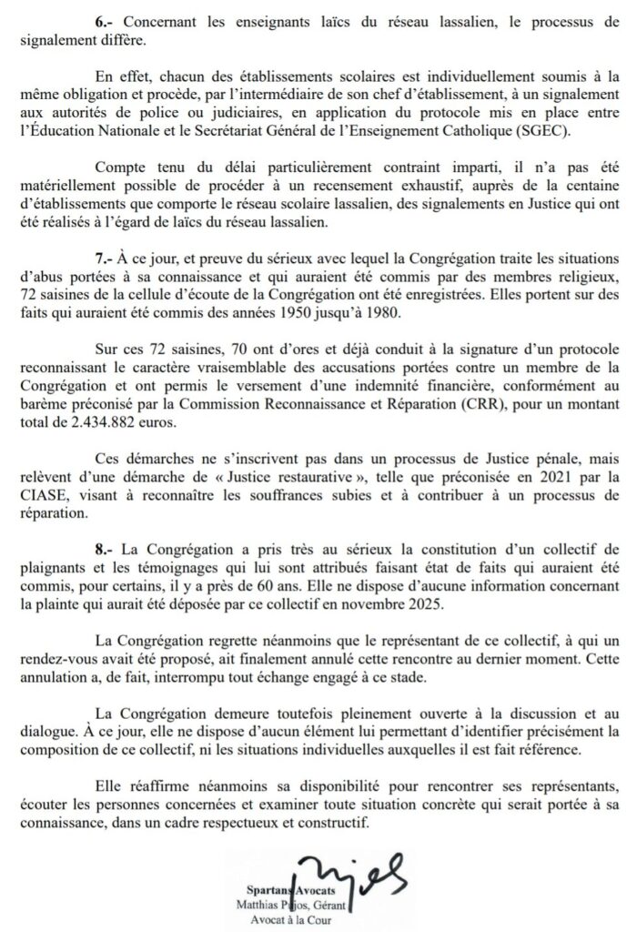 Par communiqué signé par l’avocat Matthias Pujos – qui est aussi celui des MEP (missions étrangères de Paris), autre congrégation engluée dans plusieurs scandales d’abus, les lassaliens affirment que « depuis 2022, [la congrégation] a « directement effectué trois signalements en justice, dont le dernier date du 15 décembre 2025, auprès des procureurs de la République de Besançon, Évry-Courcouronnes et Reims ».