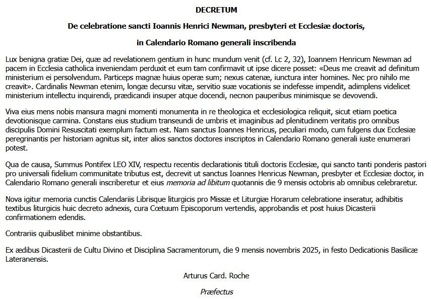 C’est pourquoi le Souverain Pontife LÉON XIV, à la suite de la récente proclamation du titre de docteur de l’Église conféré à ce pasteur d’une si haute importance pour le bien de la communauté universelle des fidèles, a décrété que saint John Henry Newman, prêtre et docteur de l’Église, soit inscrit au Calendrier romain général et que sa mémoire facultative soit célébrée chaque année, le 9 octobre, par tous.
