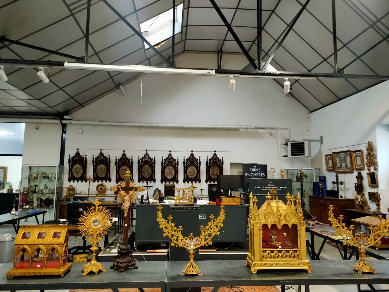 - des monstrances reliquaires (lots 121 – une paire, 123, 132, 136, 137 – une paire, 147, 151, 156, 157, 166, 167, 168, 184 – en forme de niche de style néogothique, 200, 203, 205, 212)