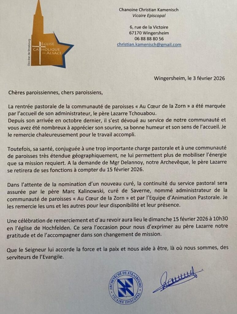 Le vicaire épiscopal Christian Kamenisch annonce par communiqué le 3 février dernier le départ du prêtre Lazarre Tchouabou, fidei donum du diocèse de Cameroun, de la paroisse « au coeur de la Zorn » pour raison de santé, « conjuguée à une charge pastorale trop importante et une communauté de paroisses très étendue géographiquement« . Le curé de Saverne prend provisoirement la suite. Il avait été installé début octobre dernier.