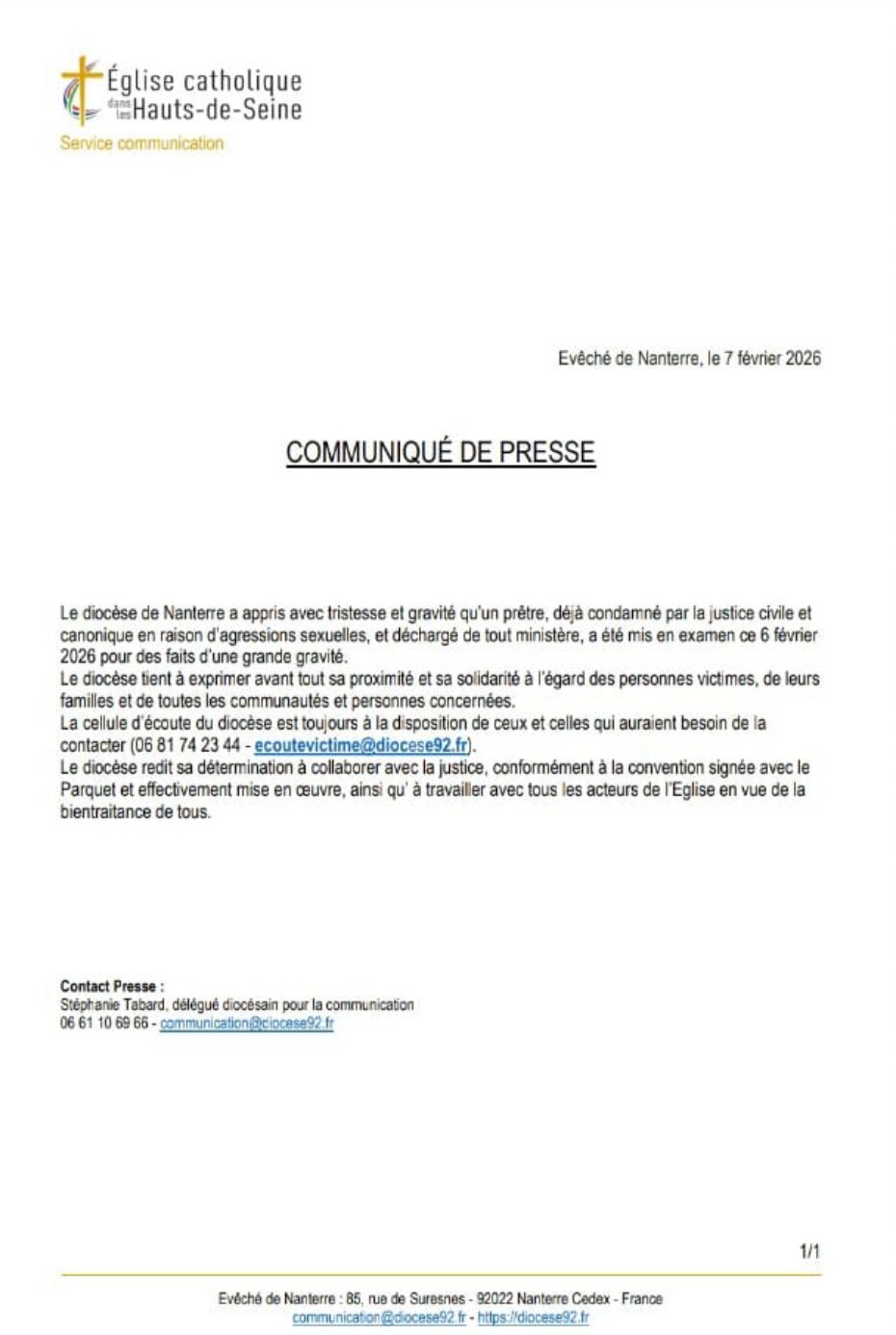 Le diocèse de Nanterre communique