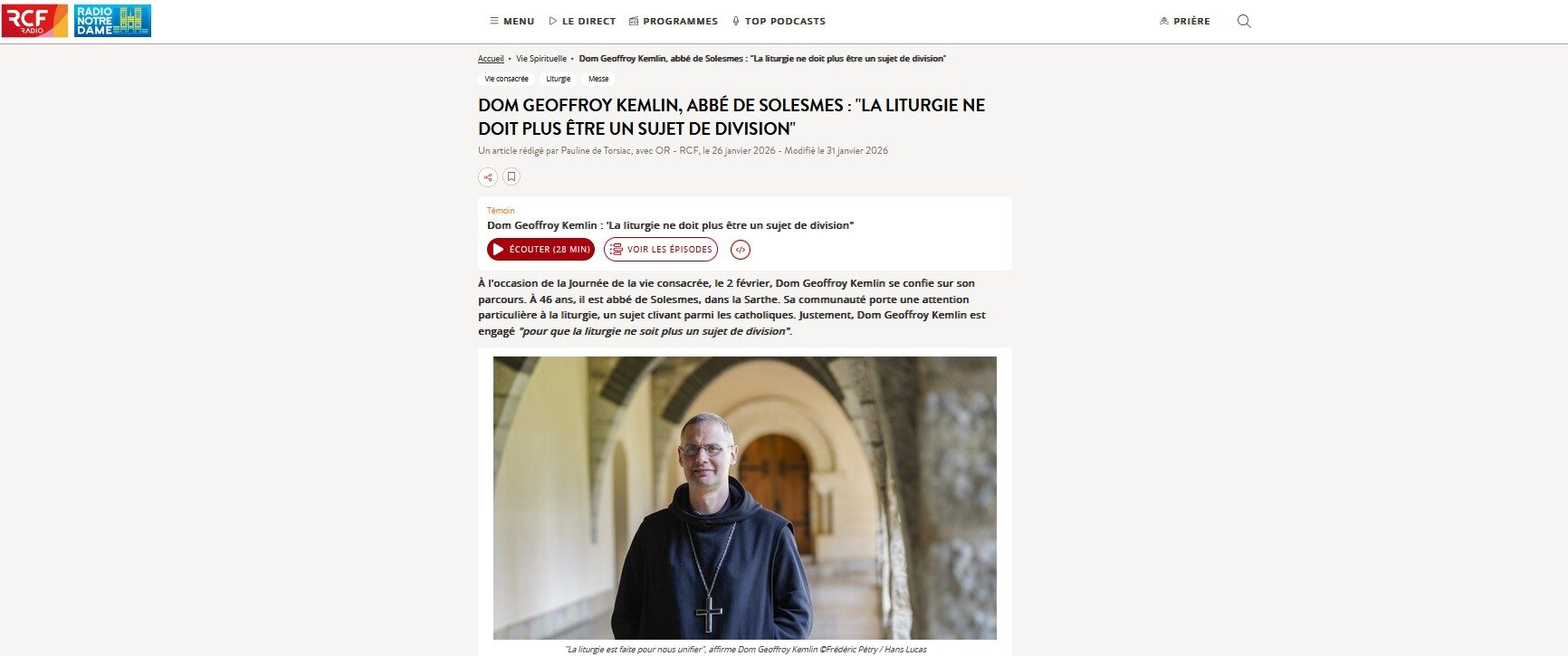 Dom Geoffroy Kemlin, abbé de l’Abbaye Saint-Pierre de Solesme, évoque la question liturgique dans une longue interview sur RCF publiée le 31 janvier (et un article qui est consacré à cet échange sur le site de RCF)