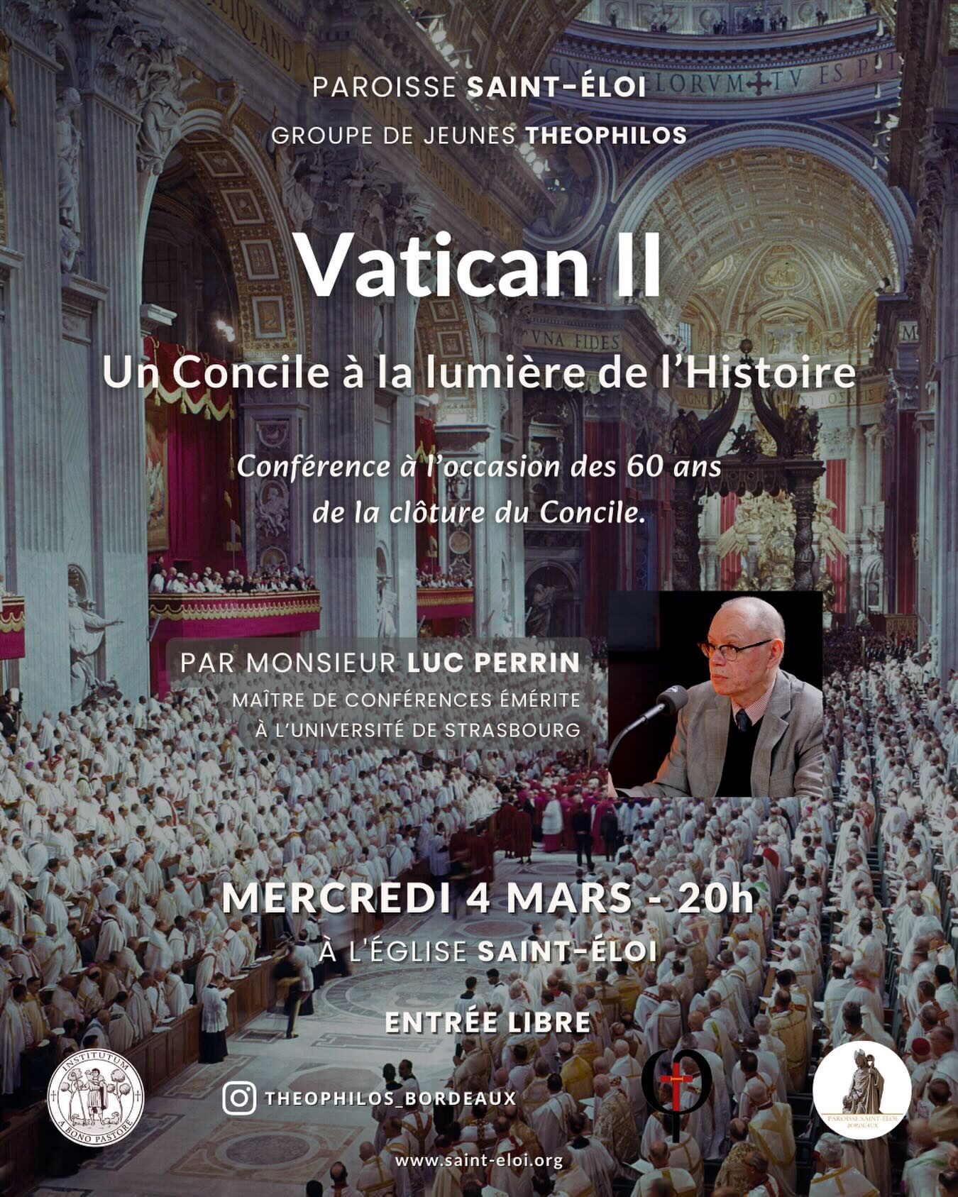 La Paroisse Saint-Eloi et le groupe de jeunes Theophilos vous invitent à la conférence du Professeur Luc Perrin « Vatican II : Un Concile à la lumière de l’histoire » le mercredi 4 mars à l’église Saint-Eloi (Bordeaux) :