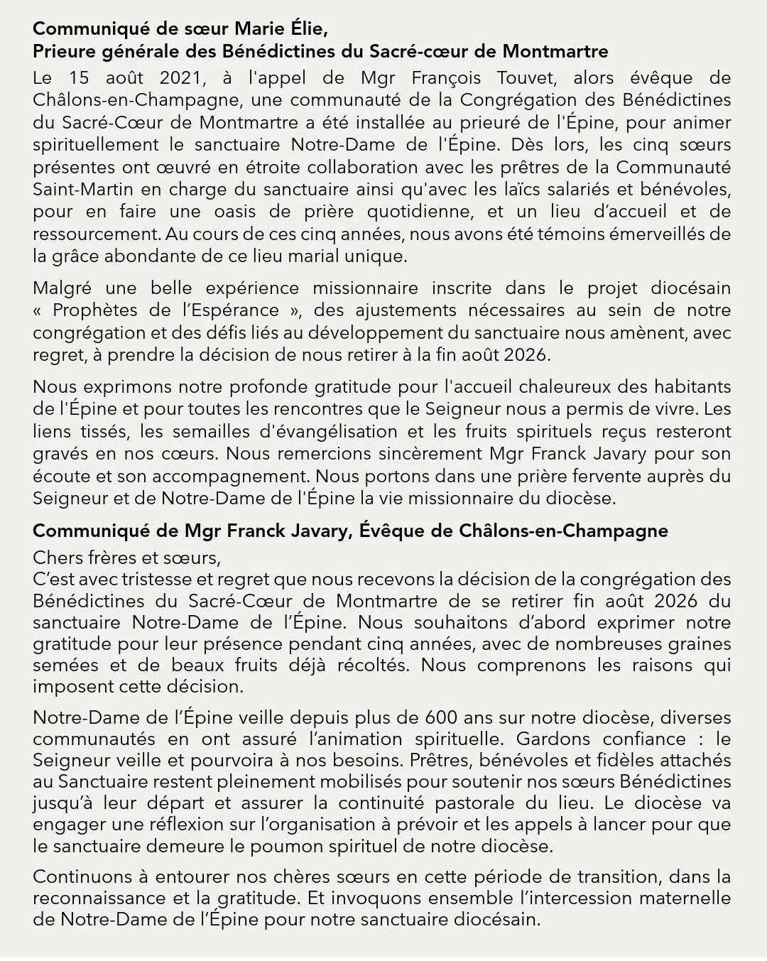 Le diocèse de Châlons en Champagne publie sur sa page Facebook un double communiqué de la supérieure des Bénédictines du Sacré-Coeur de Montmartre et de Mgr Javary, l’évêque, au sujet du départ des religieuses du sanctuaire de ND de l’Epine, communauté ouverte en 2021, en août 2026.