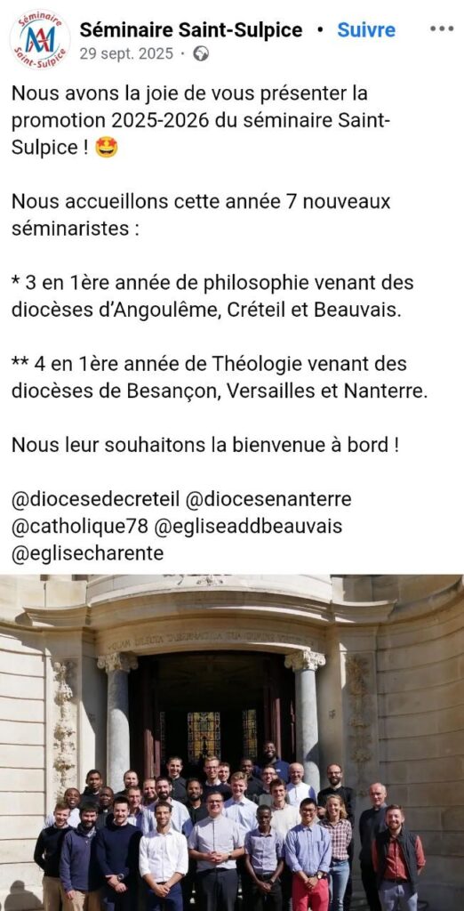Le séminaire de Saint-Sulpice à Issy les Moulineaux a publié la photo de sa promotion 2025-26, en indiquant avoir reçu sept nouveaux séminaristes : trois en première année de philosophie venant d’Angoulême, Créteil et Beauvais et quatre en première année de théologie venus des diocèses de Besançon, Versailles et Nanterre.