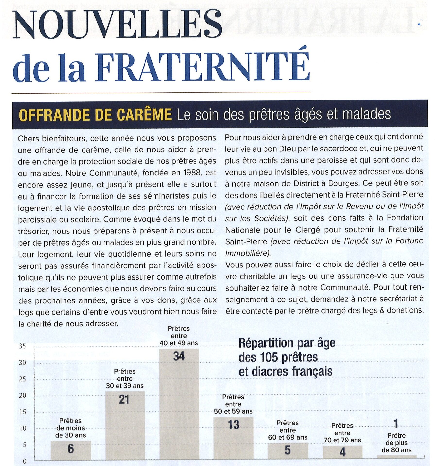 La lettre présente également ce mois-ci la chapelle de l’Institut Croix des Vents à Sées, ancienne chapelle du séminaire diocésain. Pour le Carême, elle invite à soutenir particulièrement le soin de la FSSP pour ses prêtres âgés (cf ci-dessous) :