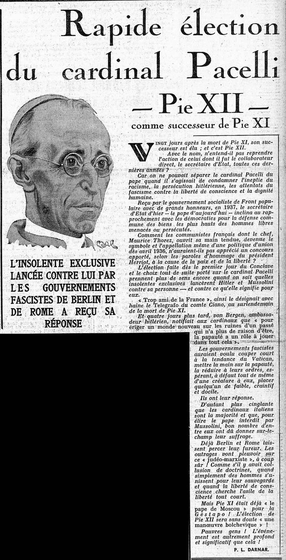 C’était le 3 mars 1939, au lendemain de son élection, Pie XII était en première page de l’Humanité, qui rappelle que les allemands en avaient fait… « le pape de Moscou » ! Mais aussi que le cardinal Paccelli avait été vu de manière hostile par Berlin et Rome. Tout cela ne manque pas de piquant quand on sait que plus tard, certains firent de ce ce pape « le pape d’Hitler ».