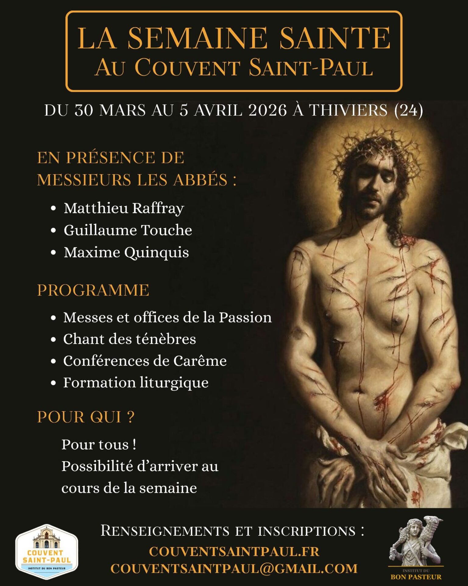 L’Institut du Bon Pasteur propose de vivre la Semaine Sainte au Couvent Saint-Paul à Thiviers (24), sa maison de retraite spirituelle en Dordogne. Ouvert à tous