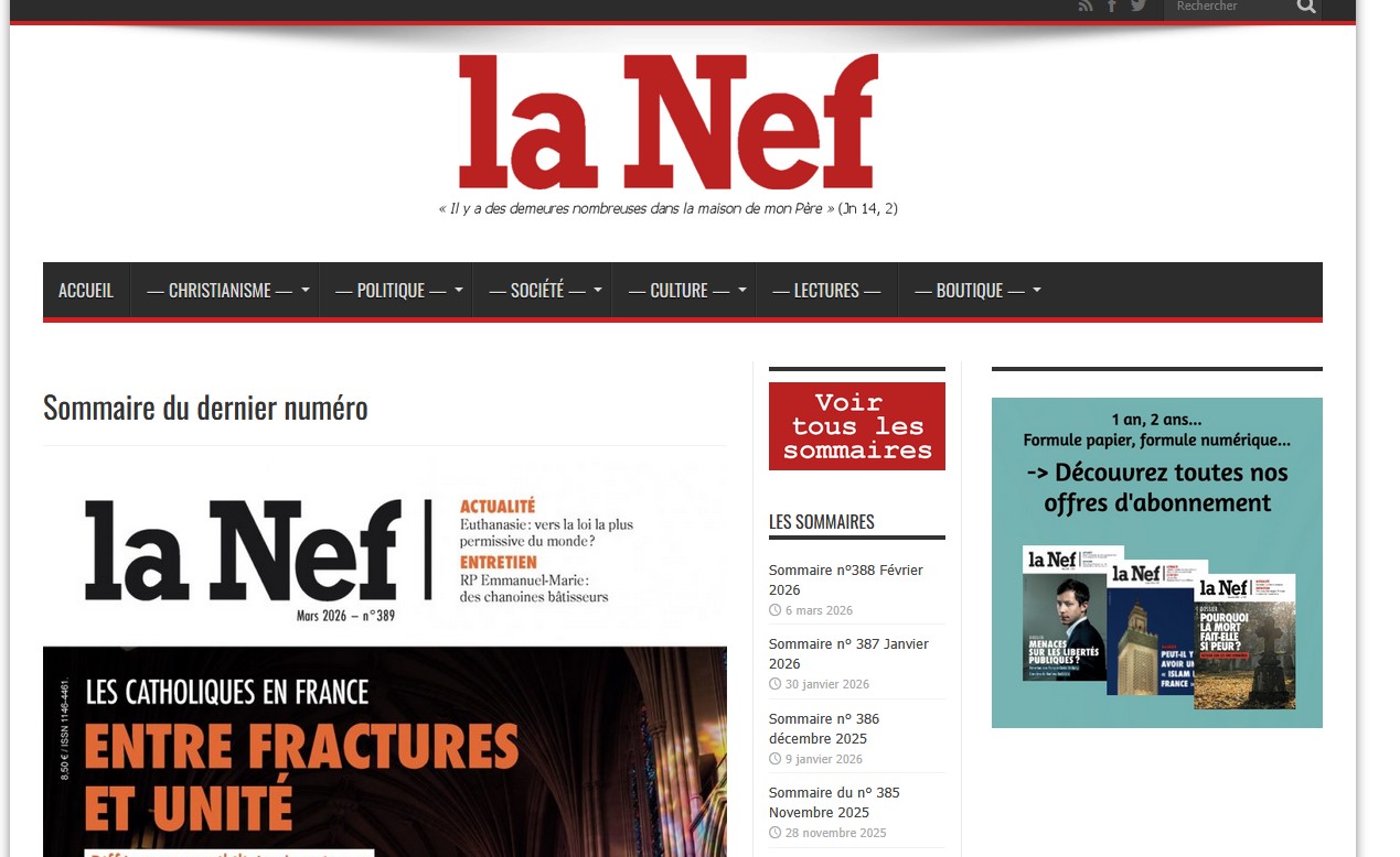 Le dernier numéro de La Nef vient de paraître (n°389, Mars 2026). Le dossier du mois est consacré aux futurs sacres d’évêques par la Fraternité Saint-Pie X « Les catholiques en France entre factures et unité ».