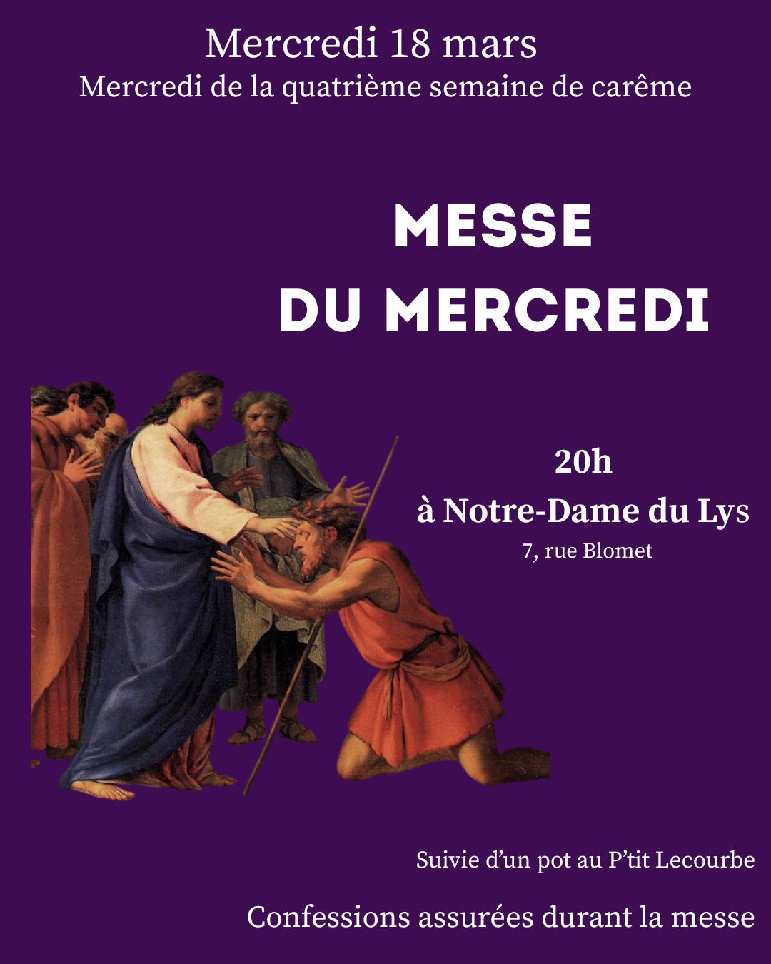 Un lecteur nous invite à rappeler que la messe (traditionnelle) du mercredi pour les étudiants et jeunes professionnels est célébrée le mercredi à 20h00 à la chapelle Notre-Dame du Lys (Paris, Métro Sèvres-Lecourbe) par l’abbé Guilhem de Labarre, FSSP (Hors vacances scolaires).
