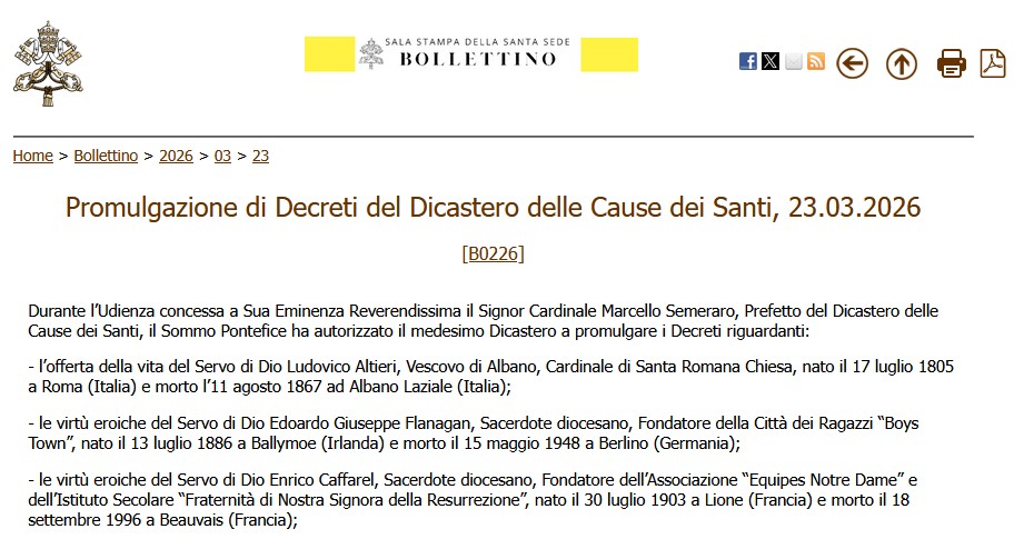 Au cours d’une audience privée ce lundi 23 mars, le Pape Léon XIV a autorisé le cardinal Marcello Semeraro, Préfet du Dicastère de la Cause des Saints, à publier les décrets reconnaissant l’offrande de vie ou les vertus héroïques de plusieurs religieux et laïcs.