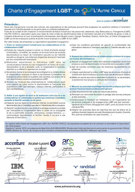Le site de promotion des droits LGBT L’autre cercle.org – qui milite notamment pour le « mariage pour tous » – a pris l’initiative de faire signer une charte par plusieurs ministres et de grandes entreprises qui engage ces derniers à mieux traiter les lesbiennes, gays, bi, trans. La cérémonie a eu lieu le 7 janvier.