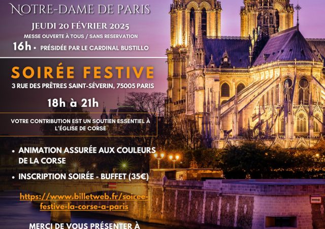 La Messe des Corses se tiendra le jeudi 20 février 2025 à la Cathédrale Notre-Dame de Paris. Cette célébration, en polyphonie corse, sera présidée par le Cardinal François Bustillo. Lire la suite ...