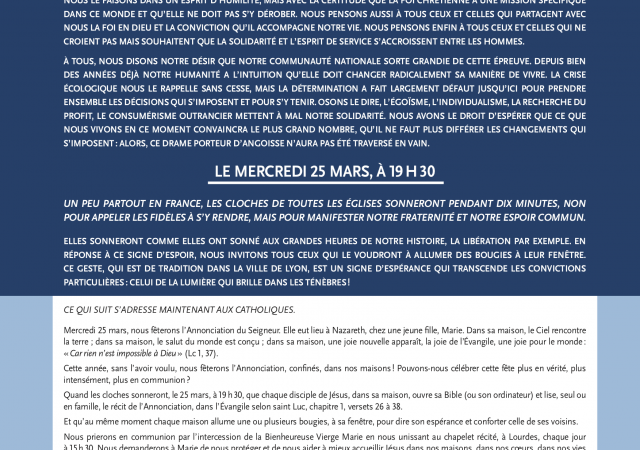 Intrigant message de nos évêques invitant pour le 25 mars les catholiques à mettre une bougie à leur fenêtre. Mais il y a une phrase qui interroge :