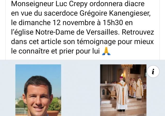 Outre les deux ordinations diaconales en vue du sacerdoce le 10 septembre dernier à la Celle saint Cloud, le diocèse de Versailles en a fait une troisième le 15 novembre dernier. Grégoire Lire la suite ...