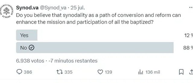 Sur X, le compte officiel du Synode a lancé une enquête sur la synodalité avant de la supprimer en raison du résultat… La synodalité a ses limites…