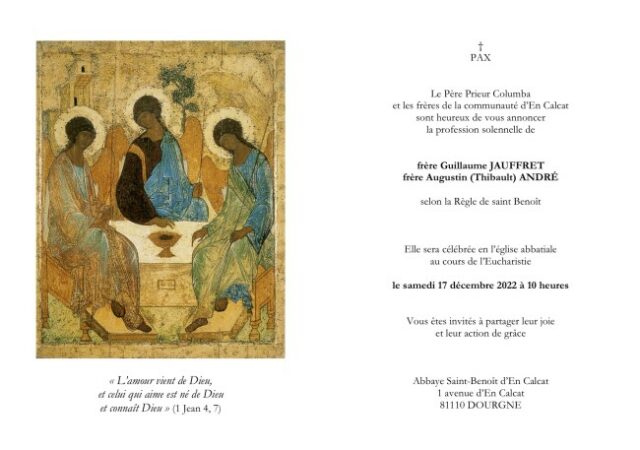 Le Père Prieur Columba et les frères de la communauté d’En Calcat sont heureux de vous annoncer la profession solennelle de frère Guillaume JAUFFRET frère Augustin (Thibault) Lire la suite ...