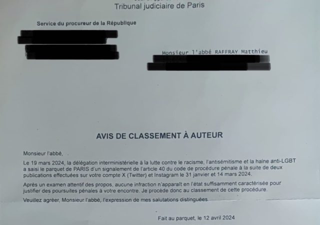 La plainte contre l’abbé Raffray (IBP) a été classée. Le 19 mars 2024, la délégation interministérielle contre le racisme, l’antisémitisme et l’homophobie (DILCRAH) avait saisi Lire la suite ...