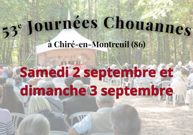 Les éditions de Chiré vous convient à leurs 53èmes Journées Chouannes à Chiré en Montreuil les 2 et 3 septembre en présence de nombreux auteurs. Une participation est demandée à l’entrée Lire la suite ...