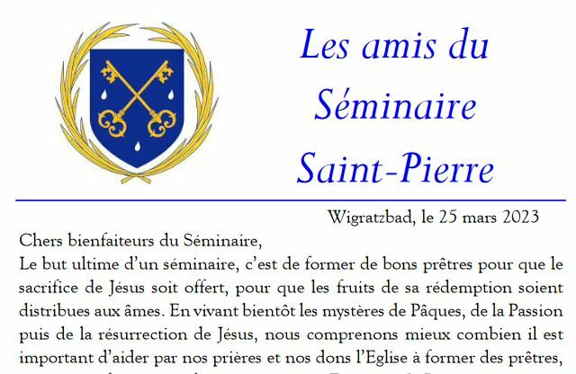 Dans la dernière lettre aux Amis et Bienfaiteurs du Séminaire Saint-Pierre de Wigratzbad (25 mars 2023), l’abbé Patrick du Faÿ, FSSP, évoque ce qui fait les qualités du prêtre Lire la suite ...