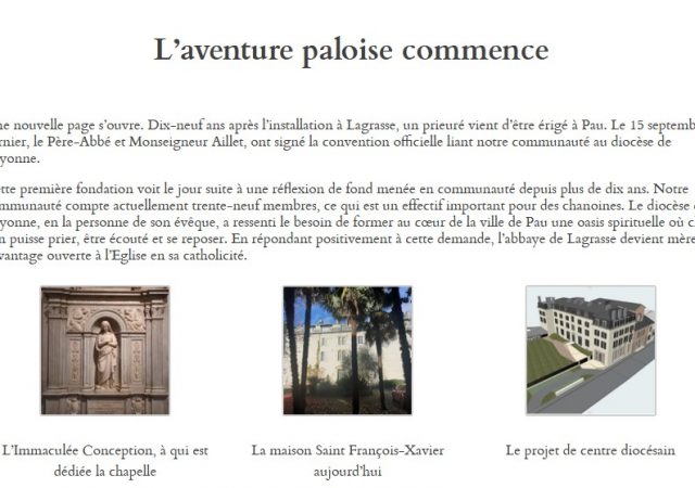 Les Chanoines Réguliers de la Mère de Dieu (Abbaye Sainte-Marie de Lagrasse) évoquent l’installation de 4 d’entre eux à Pau à la demande du diocèse de Bayonne. Ils auront Lire la suite ...